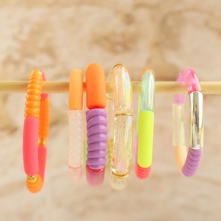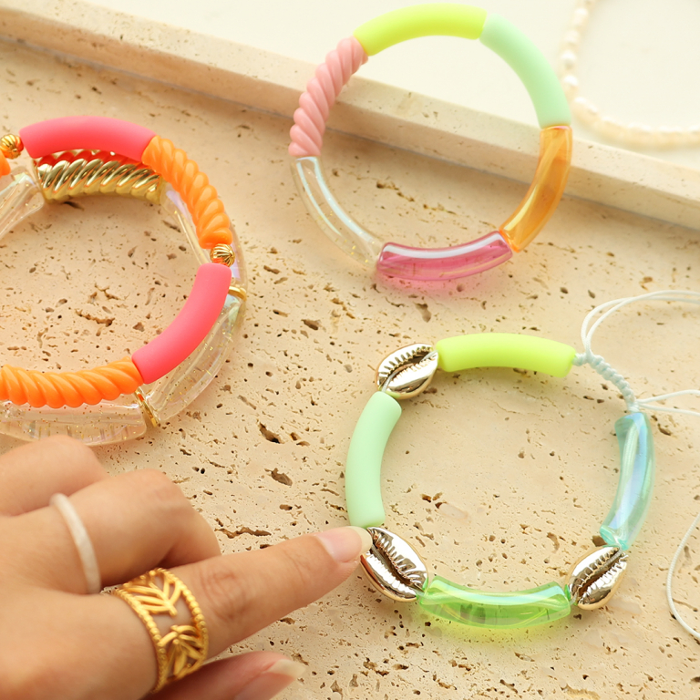 Deze nieuwe serie acryl tube kralen mat summer en AB coating is perfect voor het ontwerpen van kleurrijke armbanden. Rijg de armbanden op elastiek rijgdraad of macramé draad en combineer met bijvoorbeeld kauri schelpen voor een prachtige zomerse look!