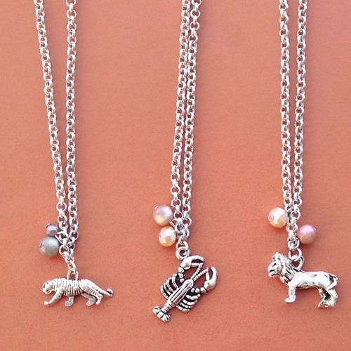 Deze armbanden en kettingen zijn fantastisch! Er is een setje kettingen gemaakt die je mooi bij elkaar kunt dragen. We hebben verschillende dierenbedeltjes van metaal aan de kettingen gehangen. Leuke bedels van een luipaard, kreeft en leeuw geven de look iets extra’s. De armbandjes zijn gemaakt met gekleurd elastiek, fascinerende Polaris Elements kralen en DQ metalen onderdelen.