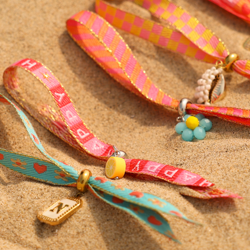 Deze nieuwe collectie lint met tekst is ontworpen door ons eigen team en bevat vrolijke teksten zoals happy, ocean child en good vibes of met vrolijke printjes zoals bloemen en hartjes. Met deze collectie kun je de leukste enkelbandjes, zonnebrilkoorden en armbandjes maken.