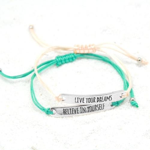 In dit inspiratie setje laten we zien hoé leuk het is om verschillende armbandjes van verschillende materialen te combineren! Er is gebruik gemaakt van zomerse kleuren waardoor er een super hippe combinatie ontstaat. De armband van 10 mm Dreamz koord is versierd met verschillende fleurige rocailles en met Griekse keramiek kralen. De rocailles hebben we eerst op 0,8 mm elastiek geregen. Daarna hebben we de rocailles om het Dreamz koord heen gedraaid. De uiteindes van elastiek hebben we nog een keer om het draad gewikkeld en vast gemaakt door een klein knoopje met seconde lijm. Deze hebben we mooi weg gewerkt onder de rocailles. Om deze armband nóg leuker te maken hebben we er een DQ bedel en een kwastje aan gehangen. Het is erg leuk om deze armband samen met hippe quote armbandjes te combineren!