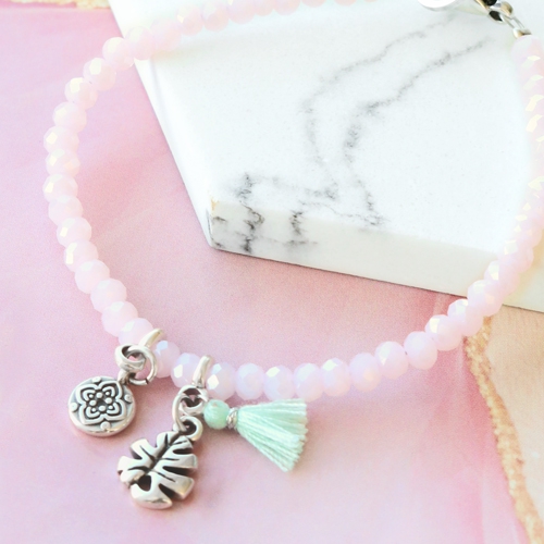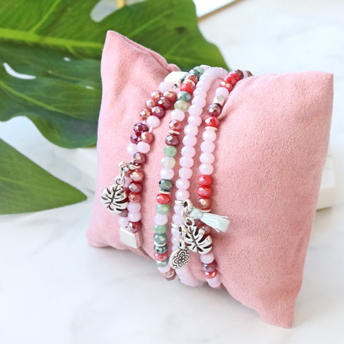 Kleurrijke minimalistische sieraden ontwerp je met facet kralen. Met de nieuwe serie zomerse facetkralen bijvoorbeeld! Combineer roze en groene tinten met elkaar voor een bijzonder leuk effect. Deze trendkleuren zijn samen een topcombinatie! De armbandjes rijg je op metaal draad en maak je af met bedels van DQ metaal en kwastjes, die je bevestigd aan een hanger met oog. Wij zijn gek op dit design. Ook met DQ leer kan je leuke armbanden met facetkralen, daarvoor gebruik je de speciale eindkappen met rijggaten