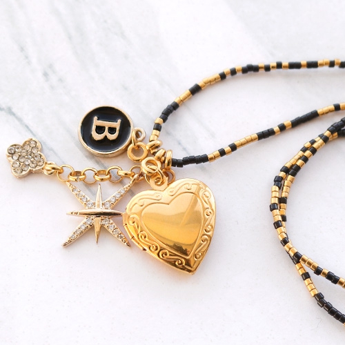 Wanneer je op zoek bent naar inspiratie voor de komende feestdagen, ben je hier aan het juiste adres! Het is erg leuk om onze nieuwe collectie strass, letter en medaillon bedels om te toveren tot prachtige kettingen. Zoals je in het voorbeeld kunt zien, hebben wij gebruik gemaakt van goudkleurige ball chain kettingen. Hieraan hebben we kleine stukjes jasseron en bedels bevestigd. Dit geeft een speels effect! Wat ook een leuk idee is, is om een ketting te rijgen op elastiek met zwarte en goudkleurige Miyuki kralen waar je ook de strass, letter en medaillon bedels aanhangt.