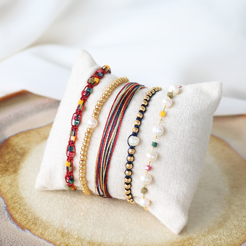 Macramé armbandjes zijn altijd goed. Iedereen vind ze leuk, het materiaal is goed geprijsd en het is ook nog eens ontzettend leuk om te maken. Bovendien past een macramé armbandje bij ieder ander sieraad of horloge. Je kunt met macramé armbandjes alle kanten op. Zo maakten wij dit keer een combinatie van tijdloze sieraden met mooie tinten met een paar feestelijke exemplaren er tussen. De feestelijke armbandjes zijn gemaakt met metallic macramé draad en zijn gecombineerd met zoetwaterparels en DQ metaal. De zoetwaterparels brengen weer wat contrast in de sieradenset door de klassieke uitstraling van de kraal. Door tijdloos en feestelijk met elkaar te combineren zorg je ervoor dat deze vrouwelijke sieraden op vele manieren gestyled kunnen worden!