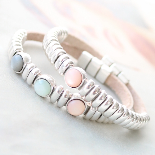 Deze stijlvolle sieraden zijn een echte aanwinst voor je voorjaarscollectie! De nieuwe cabochons van Polaris Elements hebben een luxe uitstraling. In combinatie met DQ metaal en Designer Quality leer of een Polaris Cuoio armband is dit super chique. Gebruik pasteltinten cabochons in combinatie met Cuoio armbanden of DQ leer in metalic kleuren. Dit past supergoed bij elkaar, bij het DQ metaal en het levert een prachtig contrast op.