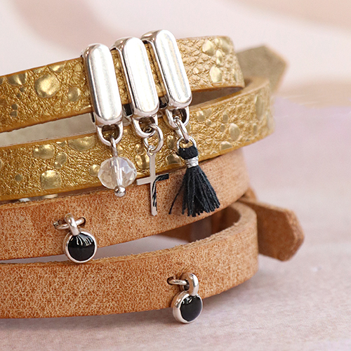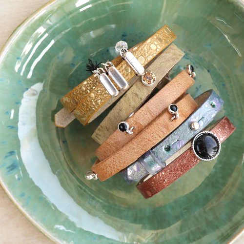 Ben je op zoek naar inspiratie voor een stijlvolle armbanden collectie? Ga dan snel aan de slag met deze Cuoio armbanden en bijbehorende schuivers en cabochons. Je kunt ook kiezen om een rivet uit de Swarovski Elements collectie te gebruiken. Wanneer je de rivet met Swarovski cabochon in de armband slaat, zorg dan dat je een zachte ondergrond gebruikt om de steen te beschermen. Als je een bedel of jasseron ketting aan de armband wilt bevestigen, maak dan met een gaatjestang twee kleine gaatjes naast elkaar. Open een buigring die je door de gaatjes haalt alvorens hem te sluiten. Bevestig daarna je bedel of jasseron ketting aan de buigring!