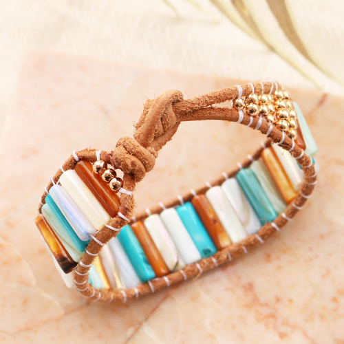 Bij het maken van deze zomerse sieraden stonden de tube schelp kralen in het middelpunt. Deze prachtige kralen zijn er in verschillende kleuren met elk een mooie parelmoerglans. Dit geeft jouw sieraden een extra stralend effect. De schelp kralen kun je gebruiken bij het maken van trendy armbandjes. Rijg de schelpkralen in combinatie met DQ metalen kralen op metaaldraad en bevestig aan het einde een slotje. Geef een extra touch aan de armband door in het midden een kauri schelp of een leuke DQ metalen bedel te bevestigen. DQ leer en schelp kralen zijn ook een prachtige combinatie. Neem twee stukken leer en bevestig daartussen de tube schelp kralen, deze kralen zet je vast met rijgdraad. Deze armband sluit je door een knoop en een lus in het leer te leggen. Succes!