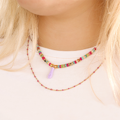 Verwerk Resin Mano fico hangers in kettingen van diverse lengtes zodat je de kettingen kunt stacken. Gebruik jasseron ketting voor de ene helft van de ketting en kralen naar keuze voor de andere helft. Sluit vervolgens de ketting met een boeislot waar je diverse bedels aan hangt.